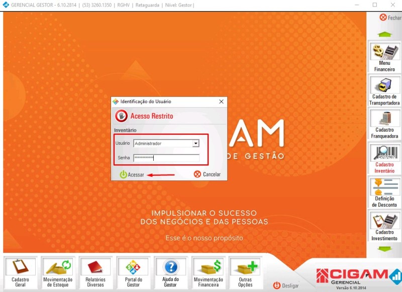 2. Para acessar o Cadastro de Inventário, insira seu usuário e senha e, em seguida, clique em “Acessar”.